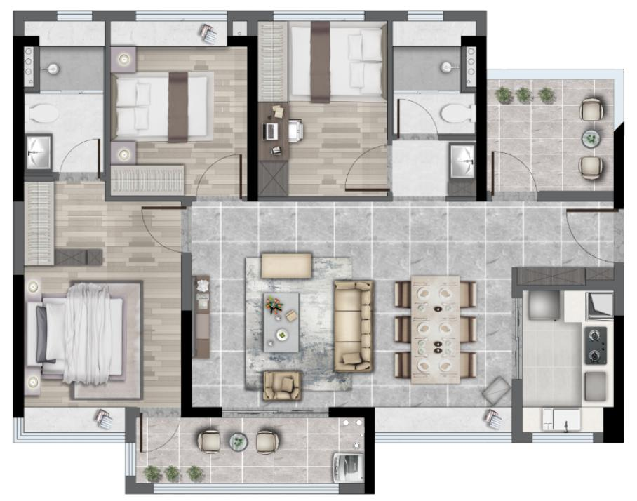 如果想要舒适度更上一层楼,可以选择约79平的2+X创意单位,动静分区明确,动线规划合理,主套设计确保主人的居住舒适度和隐私感,而且各部分功能间都保有充足尺度。