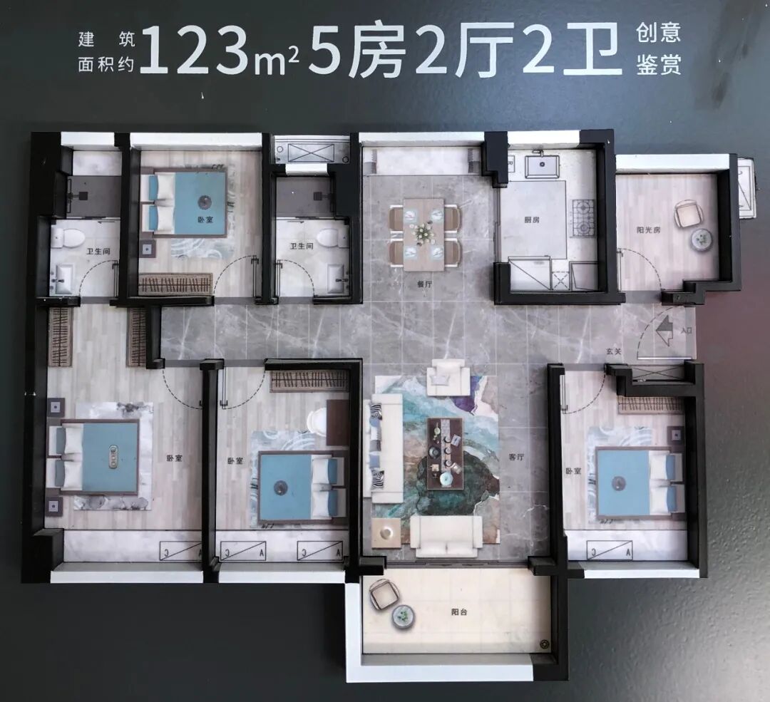 *于123㎡,项目是做到了5个房间,这在市场上还是比较少见的设计,主卧还带一个衣帽间,并且餐厅做了飘窗设计,可以说是非常实用了。