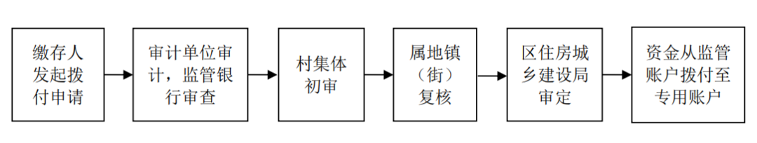 (三)项目属地村集体经济组织、属地镇(街)、区住房城乡建设局逐级审核,确定当期复建安置资金支付数额后,由区住房城乡建设局向监管银行发出《复建安置资金支付通知书》(以下简称“《支付通知书》”);