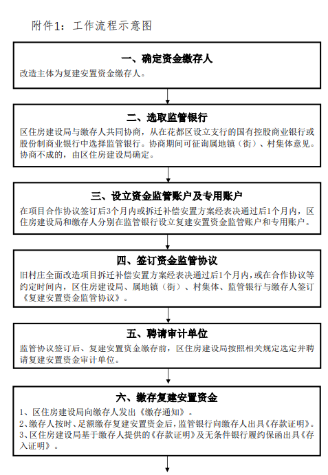 旧村庄全面改造项目拆迁补偿安置方案经村集体经济组织表决通过后1个月内,或在项目合作协议等约定时间内,区住房城乡建设局、项目属地镇(街)、村集体经济组织、监管银行与缴存人应就复建安置资金的监管签订《花都区旧村庄全面改造项目复建安置资金监管协议》(以下简称“《监管协议》”)。