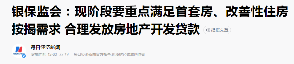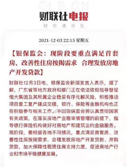 中国银保监会新闻发言人在12月3日晚答记者问中指出,将认真贯彻国家有关政策,在落实房地产金融审慎管理的前提下,指导银行保险机构做好对房地产和建筑业的金融服务。