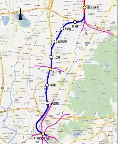 其中,广州火车站与2号线、5号线、11号线换乘,采用盖挖法施工,车站长约262.8m;乐嘉路站采用明挖法施工,车站长约278.2m;岗贝站采用明挖法施工,车站长约140.6m;马务站与规划29号线换乘,采用明挖(局部盖挖)法施工,车站长约140.2m;创意园站采用明挖法施工,车站长约264米,站后左线设双列位单停车线,配线段长430m;鹤南站采用明挖(局部盖挖)法施工,车站长约155m;彭边站采用明挖法施工,车站长度约161.75m。
