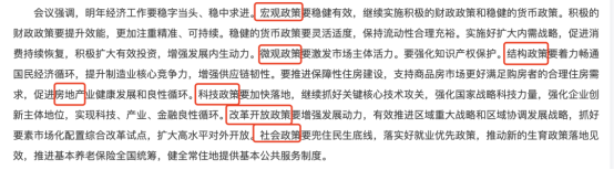 此次会议通稿用了一个段落广泛谈及多个领域的政策,包括宏观政策、微观政策、结构政策、科技政策、改革开放政策、社会政策等。