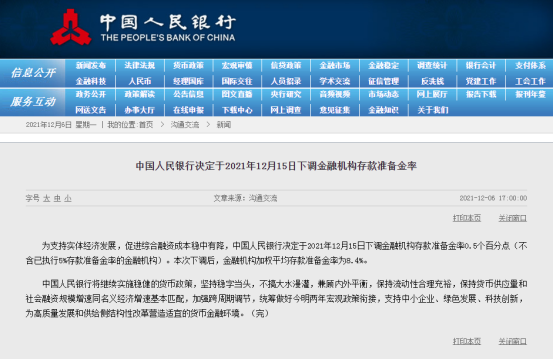 同日,中国人民银行宣布,为支持实体经济发展,促进综合融资成本稳中有降,决定于2021年12月15日下调金融机构存款准备金率0.5个百分点(不含已执行5%存款准备金率的金融机构)。