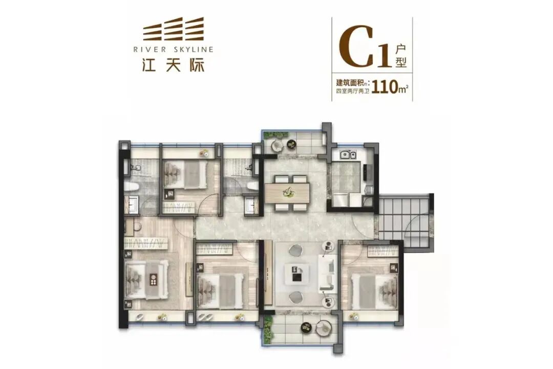 (110m² 四室两厅两卫,赠入户花园,近99%超高实用率,卧室全明飘窗,U型厨房自在烹饪,南北双阳台对流,江景尽收眼底,四开间朝南,三卧室南向瞰江,主卫干湿分离,宽尺主套设计)