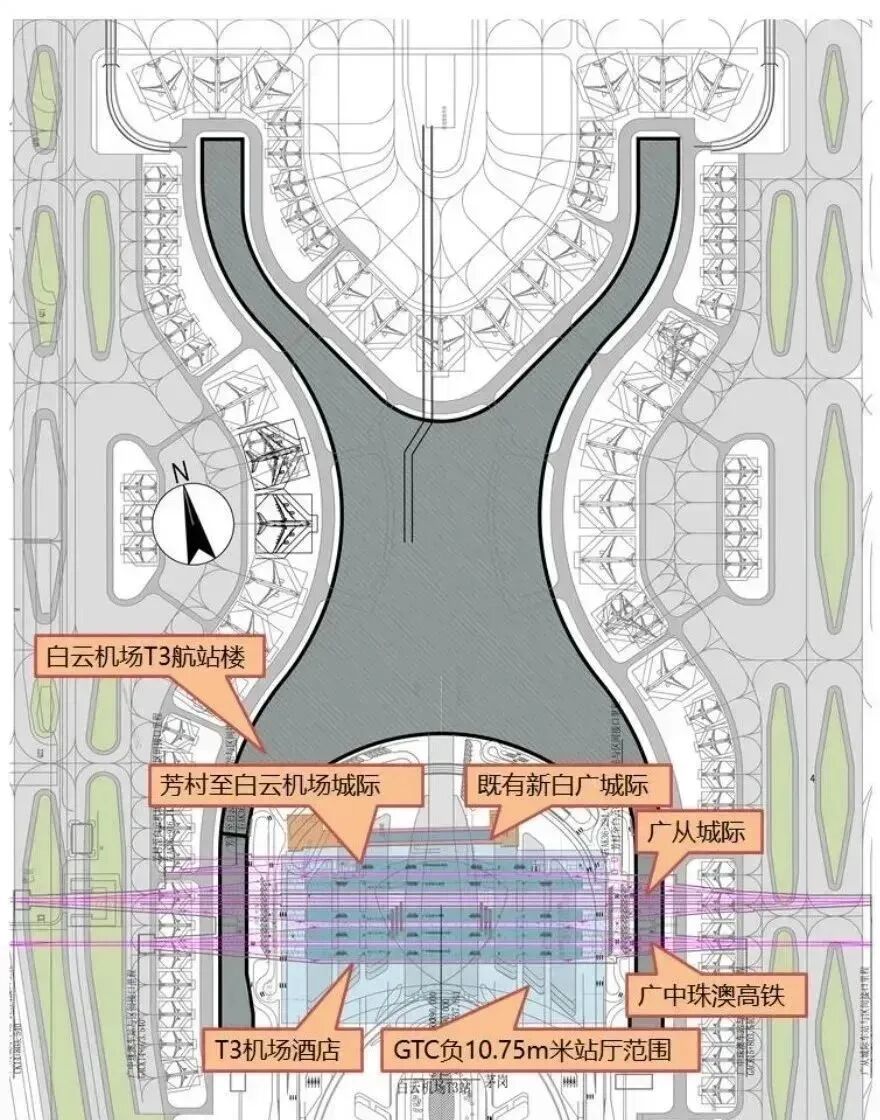 项目引入广州*珠海(澳门)高铁、广从城际(广河高铁)、芳村*白云机场城际等线路,包括车站主体和机场红线范围内车站两端区间的预留土建工程。