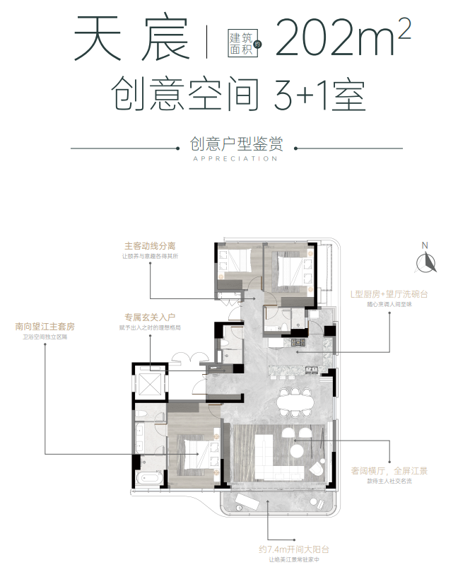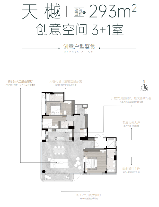 从户型图也能看出,项目产品设计的主要逻辑就是“江景*大化”,例如建面约293㎡的3+1房,就做了观景大边厅+大阳台,在室内能270°看江,江景居住体验非常好。