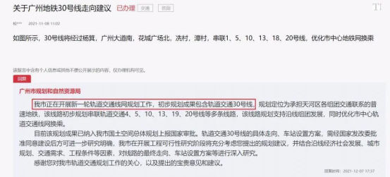 近日,广州市规划和自然资源局在人民网领导留言板回复网友咨询时表示,广州地铁 30 号线已经在新一轮的轨道交通网初步规划成果当中。