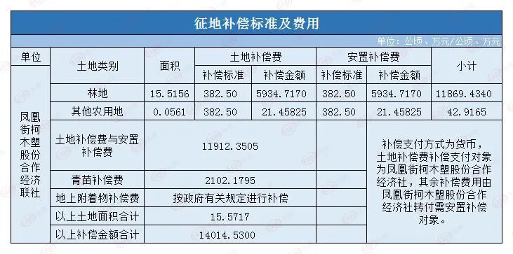 根据公告,本次拟征收土地总面积15.5717公顷,现状地类为农用地15.5041公顷(林地15.4480公顷,其他农用地0.0561公顷),建设用地0.0676公顷。不占用*基本农田,均为凤凰街柯木塱股份合作经济联社所有。