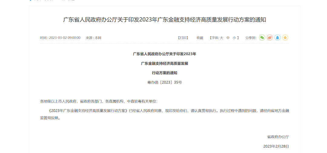 3月2日,广东省人民政府办公厅发布关于印发2023年广东金融支持经济高质量发展行动方案的通知。