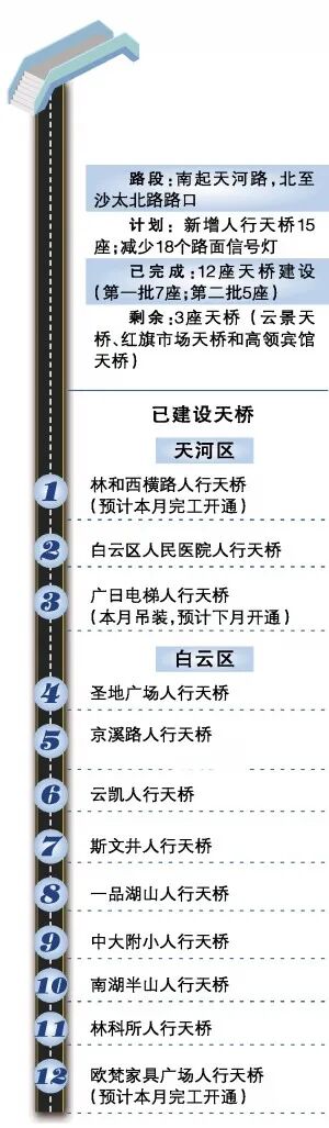 这12座天桥分别为*广场、京溪路、云凯、斯文井、一品湖山、南湖半山、林科所、林和西横路、白云区人民医院、中大附小、广日电梯(预计春节前开通)、欧梵家具广场人行天桥(预计12月底开通)。