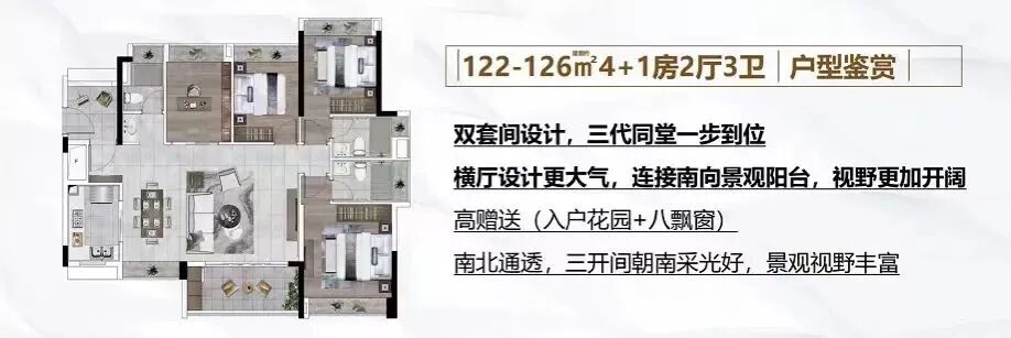 122-126平拥有双主套设计,这在天河少见,配合上大横厅大四房设计,很多改善家庭非常需要这种户型。