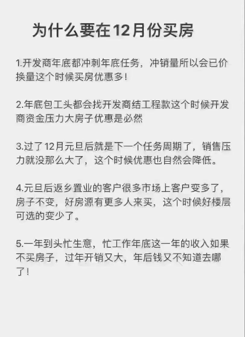 房产销售为了年底冲刺业绩、完成绩效考核、开单过肥年,他会帮你拼命谈价以争取到*大的折扣。