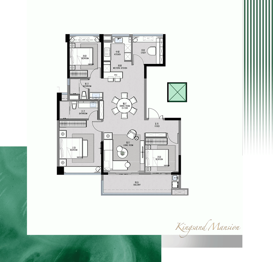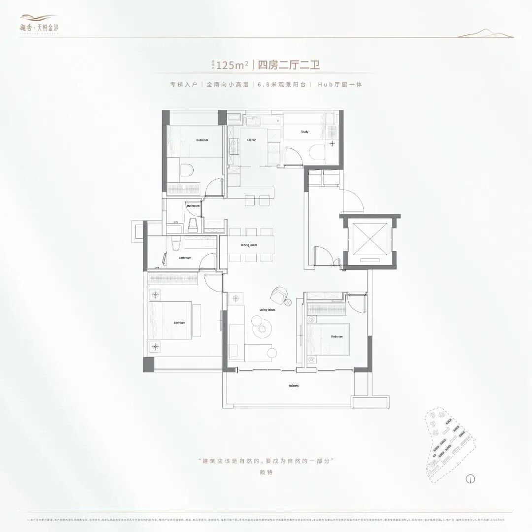 建面约125㎡的四房户型,三开间朝南,客厅和卧室连接近6.8米阳台,打造近10米的南向超大面宽,形成对望园林的阔景视野: