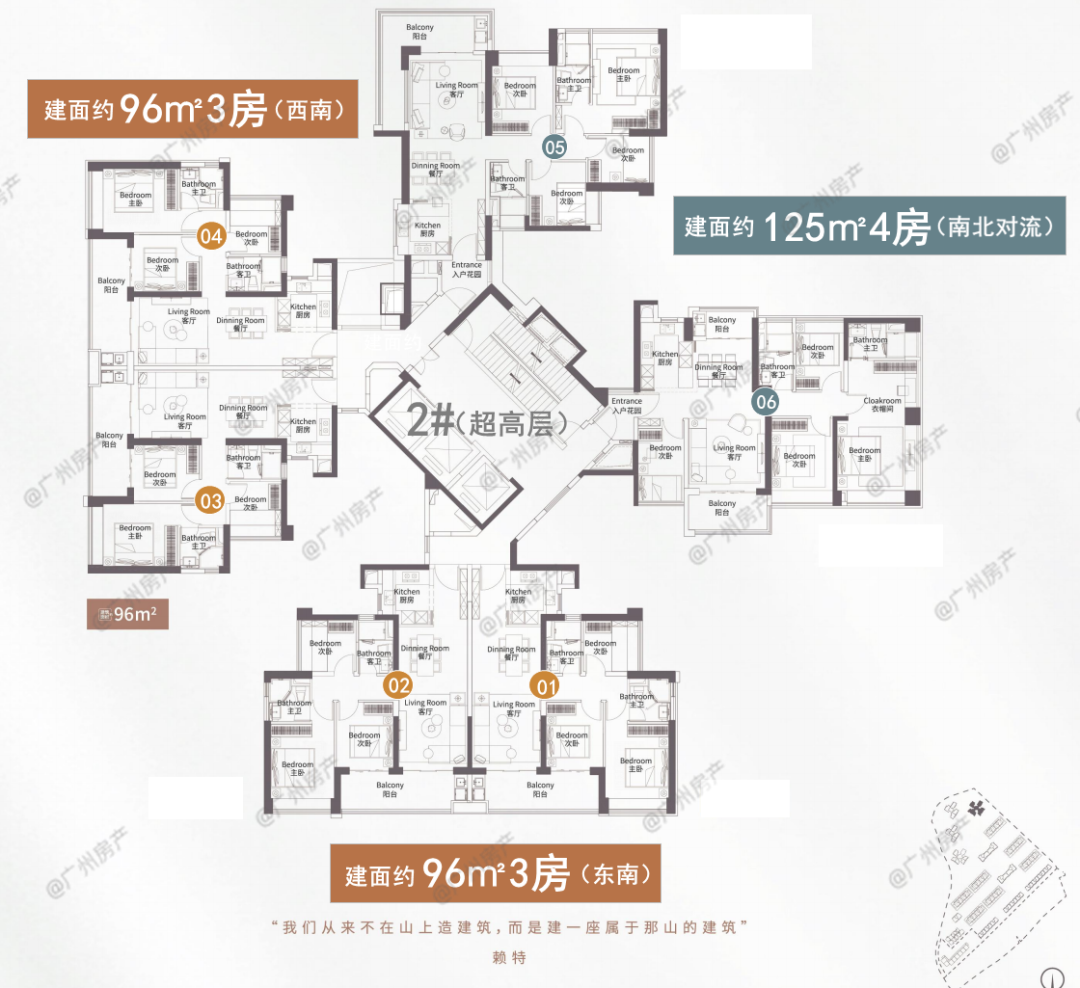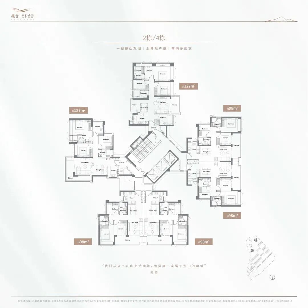2#(超高层),3梯6户设计,户型涵盖建面约127㎡4房和98㎡3房。