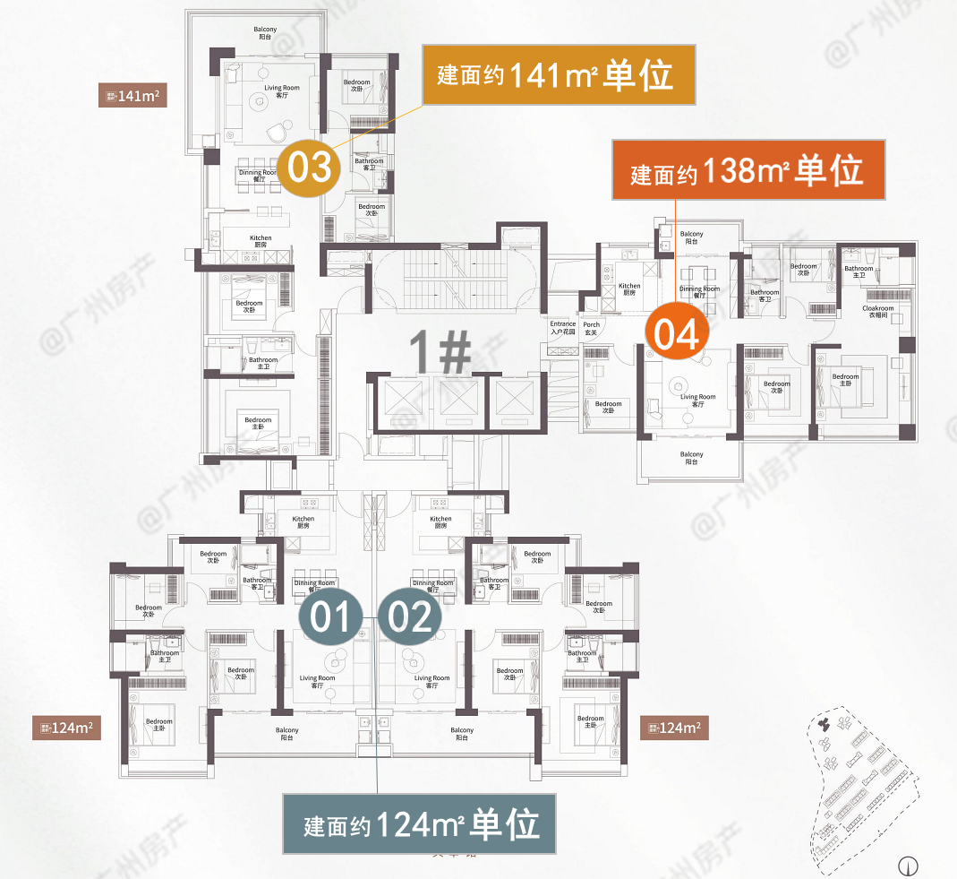 其中,1#为三梯四户设计,以4房大户型为主,涵盖建面约125㎡4房、138㎡4房和141-143㎡4房。