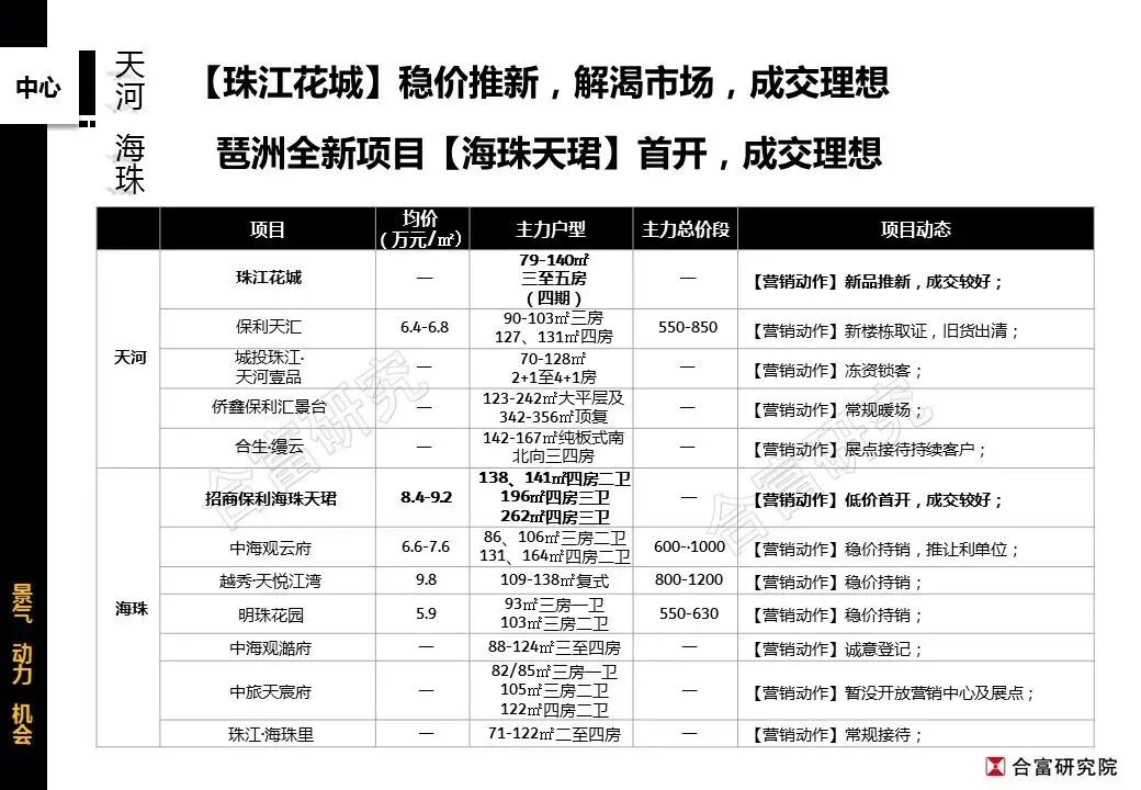 2)海珠*江景项目招商保利海珠天珺*推*;天河“渴市”加推,珠江花城去化约九成。