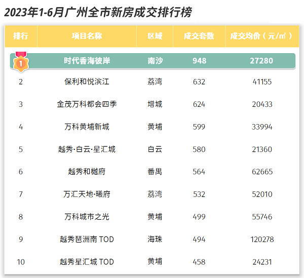 据中指院数据显示,2023年上半年,广州新房成交前十名榜单中,*区仅占3个,其余7个都是近郊或远郊。排行榜前三名分别是:时代香海彼岸(南沙)、保利和悦滨江(荔湾)、金茂万科都会四季(增城)。