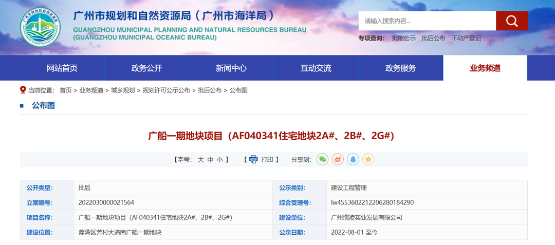 8月1日,广州市规划和自然资源局公布了广船一期地块项目(AF040341住宅地块2A#、2B#、2G#)的批后公布图,该项目已被命名为广州滨江上都。