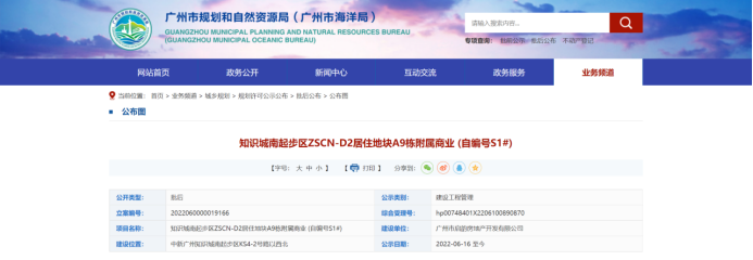 6月16日,广州市规划和自然资源局公示了知识城南起步区ZSCN-D2居住地块A9栋附属商业 (自编号S1#),知识城南起步区ZSCN-D2居住地块-住宅(自编号D1~D4)和知识城南起步区ZSCN-D2居住地块-住宅(自编号D9~D12及地下室)建设规划的批后公示。