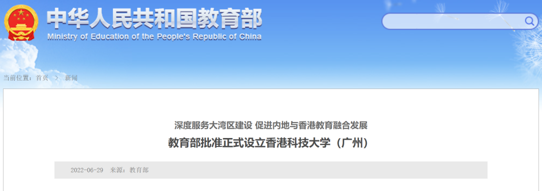 今早(6月29日),教育部官网发文宣布:批准正式设立香港科技大学(广州)。