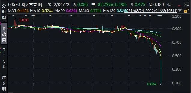 4月22日,天誉置业午后跳水暴跌超80%,报0.12港元/股,成交额0.79亿港元。天誉置业称,由于公司近12个月待偿借贷约为67.8亿元,而期末公司限制性现金、现金及现金等价物合计约42.1亿元,因此对持续经营构成重大不确定性。