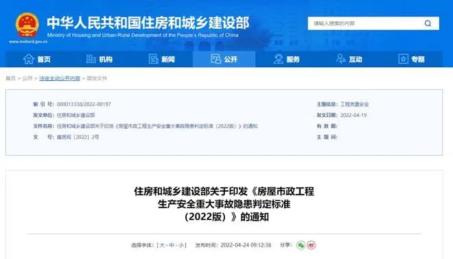 近日,住房和城乡建设部印发通知,公布《房屋市政工程生产安全重大事故隐患判定标准(2022版)》(以下简称《判定标准》),要求各地认真贯彻执行。