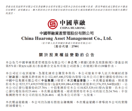 3月29日,中国华融公告:为优化国有金融资本布局,公司股东中华人民共和国财政部拟将其持有的公司24.07亿股内资股(占公司已发行总股份的3%)向中信集团增资。